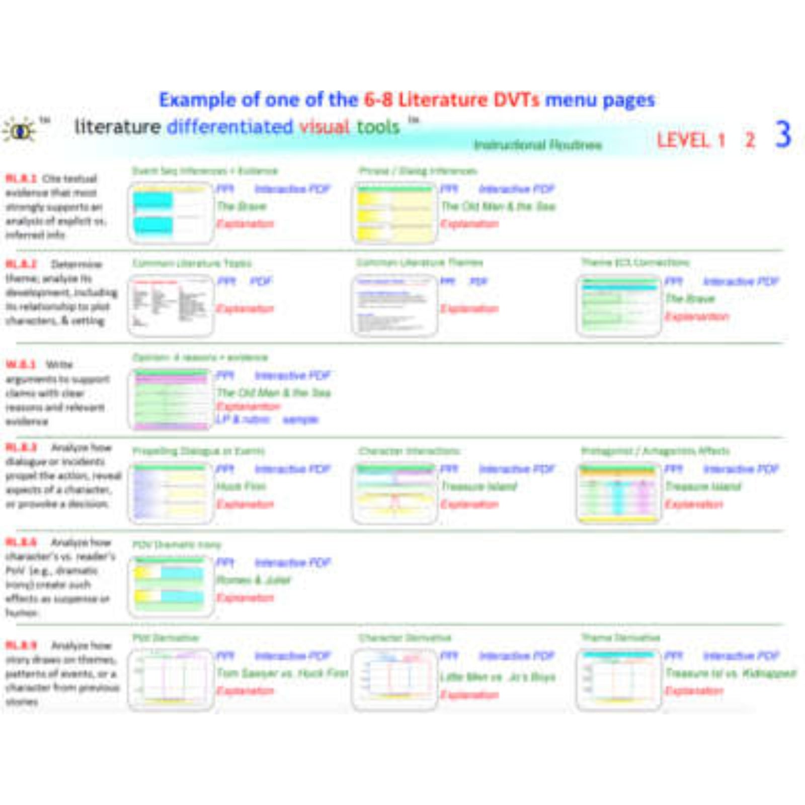 The 6-8 Differentiated Visual Tools for LITERATURE Reading and Writing Core Standards consist of a collection of interactive discipline-specific visual tools, each individually designed to address key essential understandings associated with the following topics:
